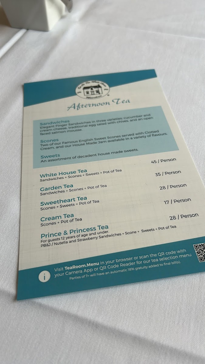 I went to the Tea at the White House for the first time and had an amazing experience! The ambience was nice but the real star of the show was the food and the tea! The decoration was not as extravagant as some tea rooms I've been to; but still nice. The tea: There was an abundance of teas to choose from. Making a decision of which tea to choose is definitely a difficult one. The one I ended up getting was a white peach tea which was great. The savories: these were very good. The cucumber and egg salad were both repeated but everything still tasted very nice. The bread was fresh and everything was seasoned well. The sweets: The sweets were good with everything tasting fresh and made in house. Nothing super exceptional but I don't have the biggest sweet tooth. The scones: This was by far my favorite bite. These scones were the best I have ever tasted! Really loved the flaky and crispy scones. The jam and clotted cream were also really delicious. Overall I loved my experience here. The food was great and service were great. I would definitely go out of my way to come back in the future!